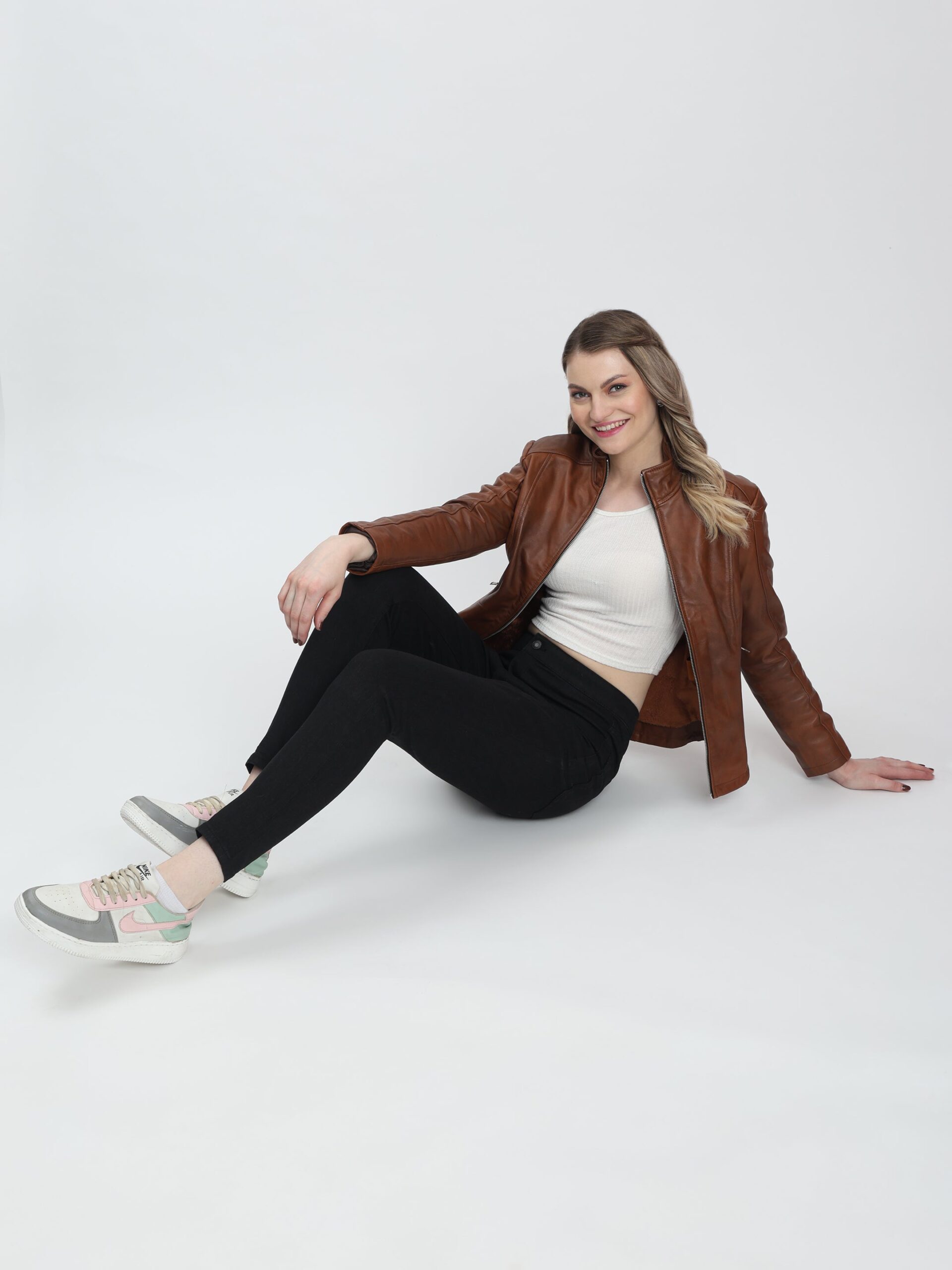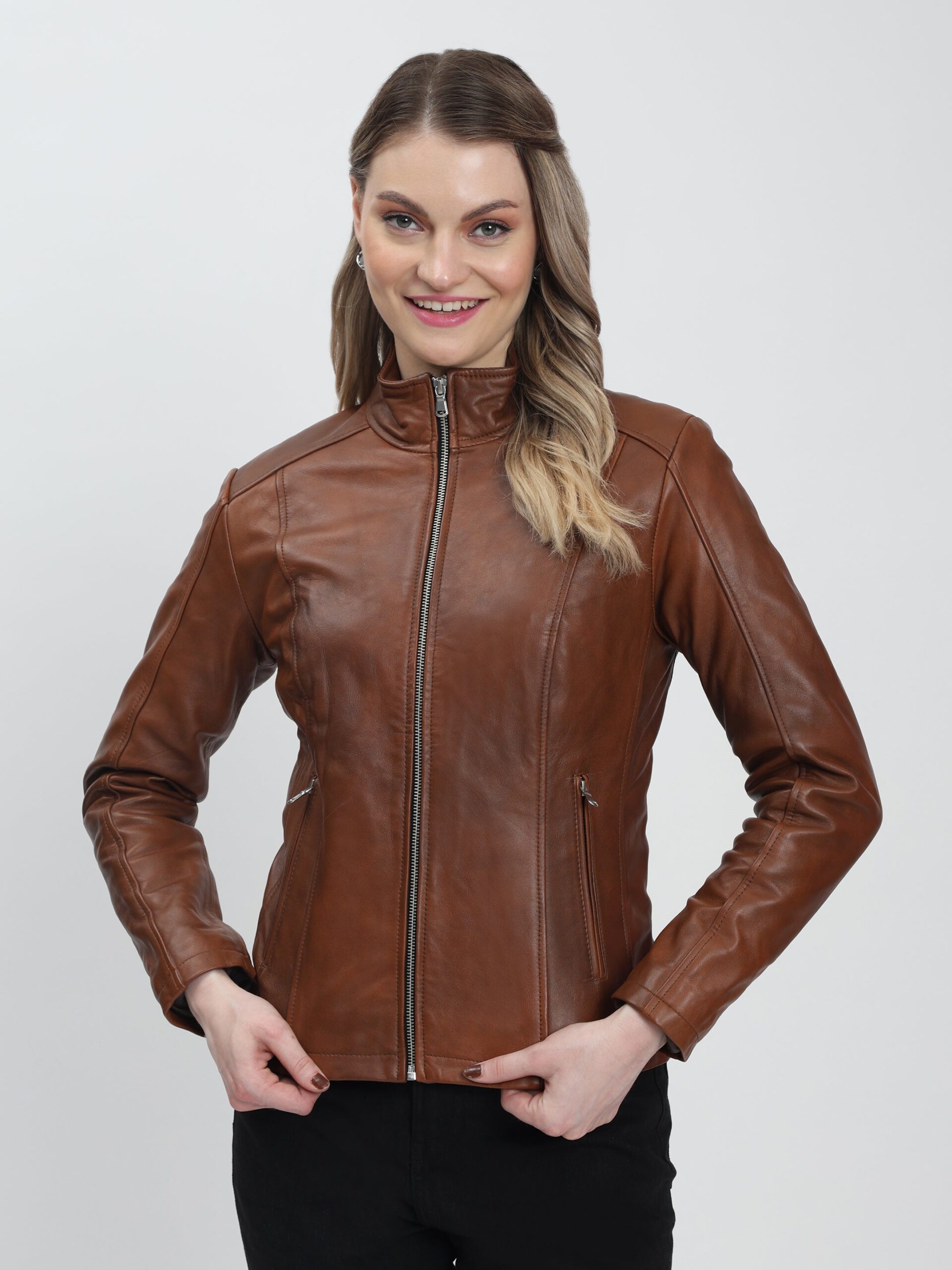 The stand collar, clean seam detailing, and slim zippered pockets add subtle sophistication without overwhelming the design. Finished in a warm Antique Brown shade, the Aurelia Jacket pairs seamlessly with denim, trousers, or dresses—making it a versatile essential for both casual and refined occasions.