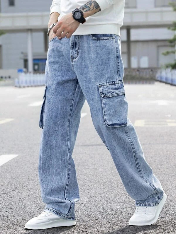 Blue Stone Wash Baggy Fit Cargo Men Jeans are an upgrade from the standard style of denim. The jeans are made from the high quality cotton denim, so you can be sure that they will last. The cargo pockets are not just for style but for practicality, as well. You are gonna fall in love with this fit.