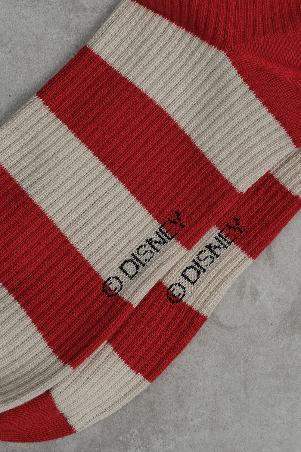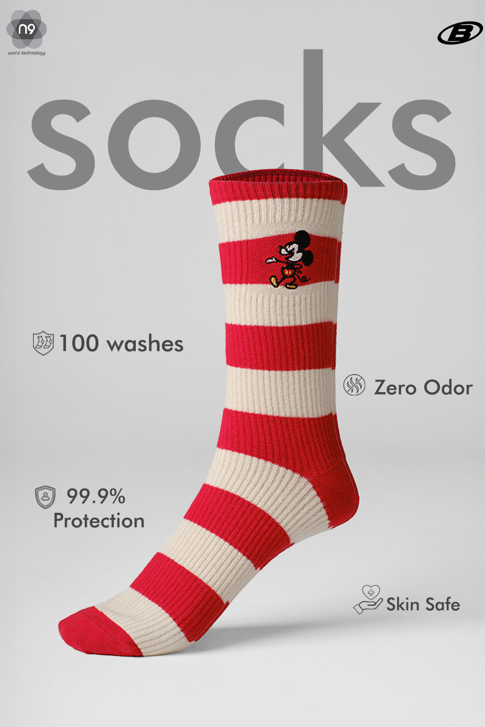 The Disney Mickey Mouse Ankle Socks bring classic iconography and advanced hygiene to everyday comfort with playful confidence. FeaturingN9 Pure Silver technology, these socks neutralize 99.9% of odor-causing bacteria, keeping feet fresh through extended wear while lasting 100+ washes. The bold red and white striped design adds a pop of color, while the signature Mickey detailing gives it that nostalgic charm blended with modern street style. Made from a high-quality mix of 80 percent cotton, 18 percent polyamide, and 2 percent elastane, the fabric feels soft, breathable, and flexible for all-day wear. The cotton keeps your feet cool and comfortable, while the stretch ensures a snug, stay-in-place fit that moves naturally. Designed for daily use, the crew length pairs perfectly with sneakers, slides, or casual shoes, adding a stylish edge to any outfit. Created for anyone who appreciates details that speak personality, the socks deliver lasting softness, durability, and hygienically advanced protection with classic Disney energy in every step.