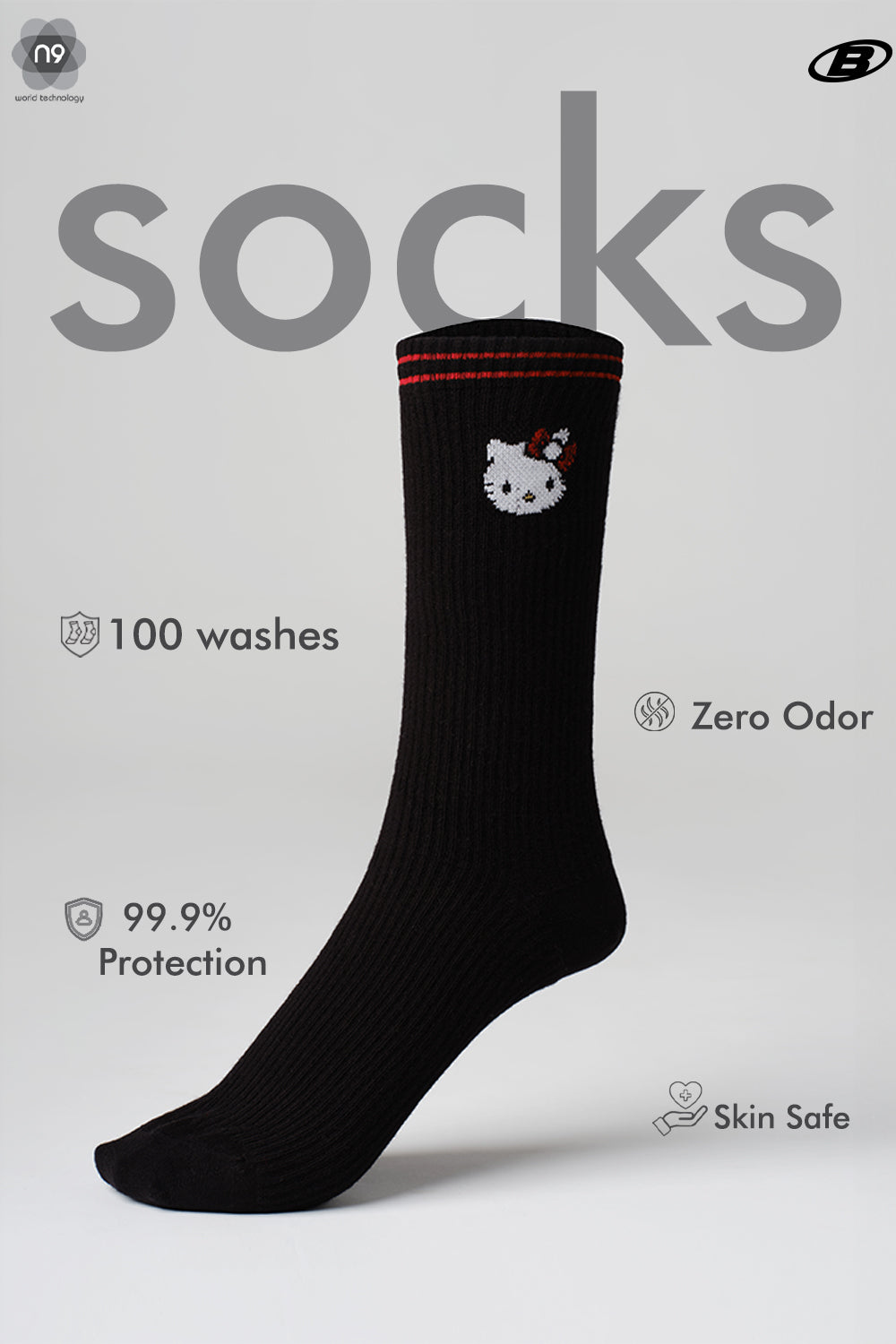 The Hello Kitty Ankle Socks bring playful charm and advanced hygiene to everyday essentials while keeping comfort at the forefront. FeaturingN9 Pure Silver technology, these socks neutralize 99.9% of odor-causing bacteria, keeping feet fresh through extended wear while lasting 100+ washes. The black base offers versatility, making them easy to pair with sneakers, casual shoes, or slides, while the signature Hello Kitty detailing adds a subtle, iconic charm. Made from 80 percent cotton, 18 percent polyamide, and 2 percent elastane, the fabric feels soft, breathable, and slightly stretchy, providing a secure and comfortable fit that moves naturally with every step. The cotton ensures a gentle feel against the skin, while the elastane and polyamide maintain shape and durability, making the socks ideal for all-day wear. Designed for anyone who values functional yet fun accessories, these crew-length socks combine comfort, style, and hygienically advanced protection. Each pair transforms a wardrobe essential into a playful statement with modern practicality for effortless everyday wear.