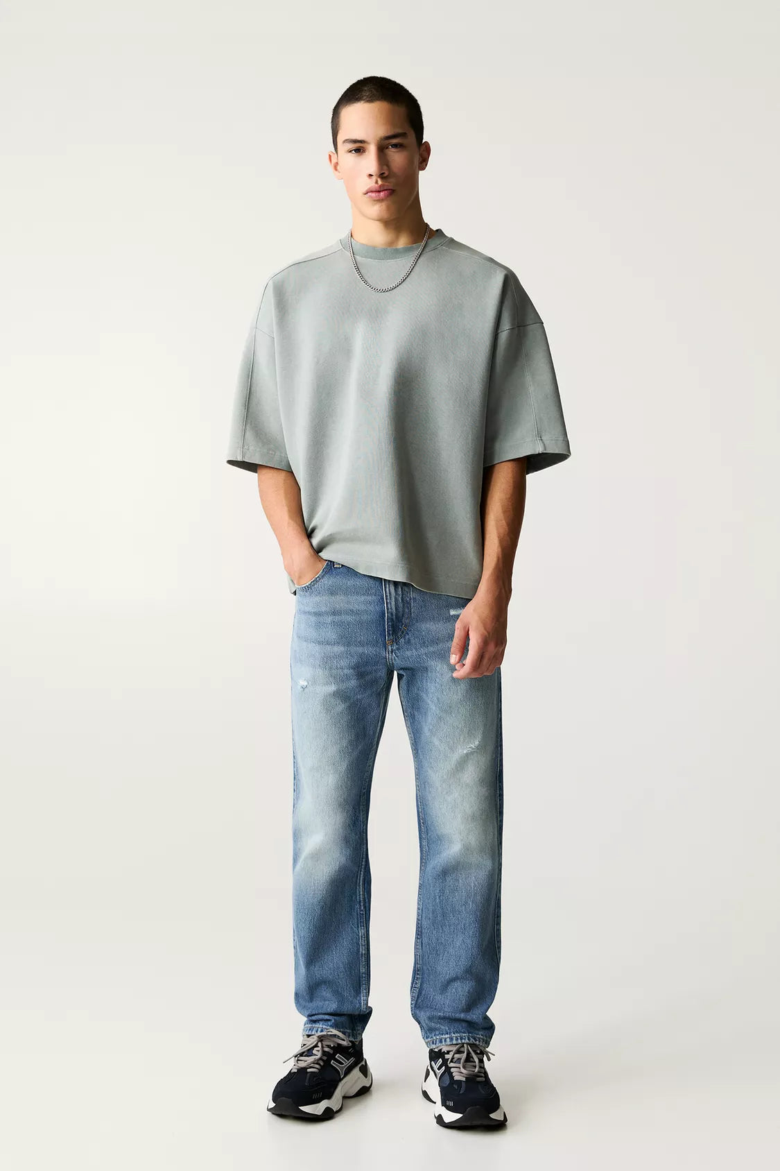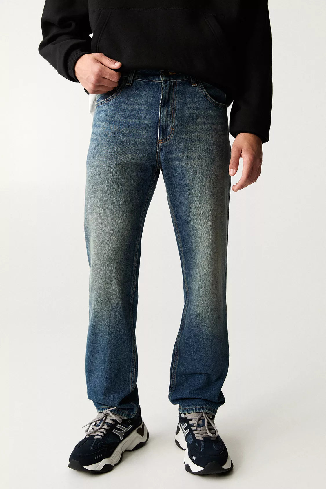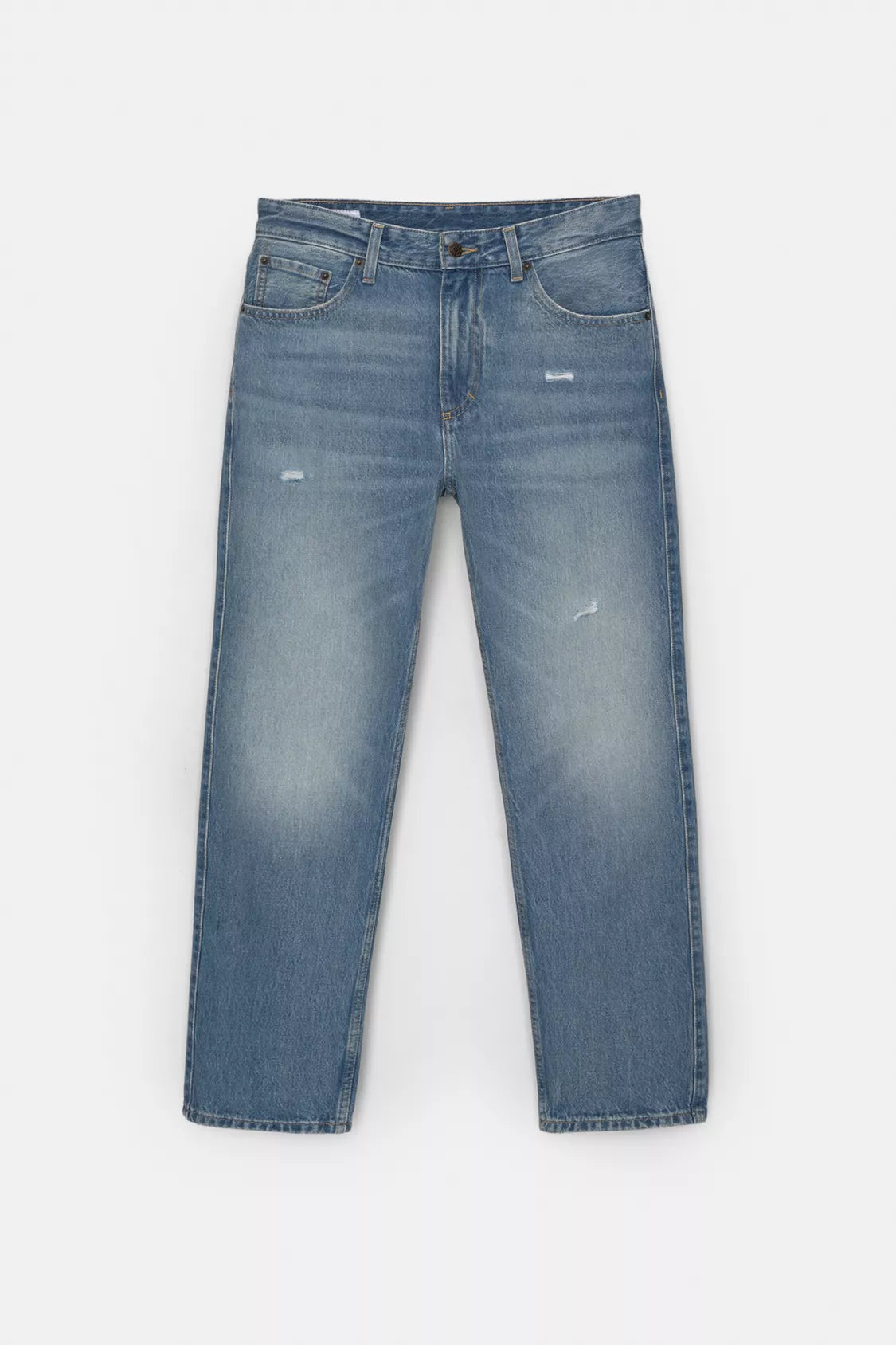 These light-wash jeans channel a vintage vibe with subtle abrasions and gentle fading down the thigh. Built in a rigid, heavyweight denim with no stretch, they deliver a structured silhouette with a classic straight-leg fit—ideal for off-duty style with attitude.