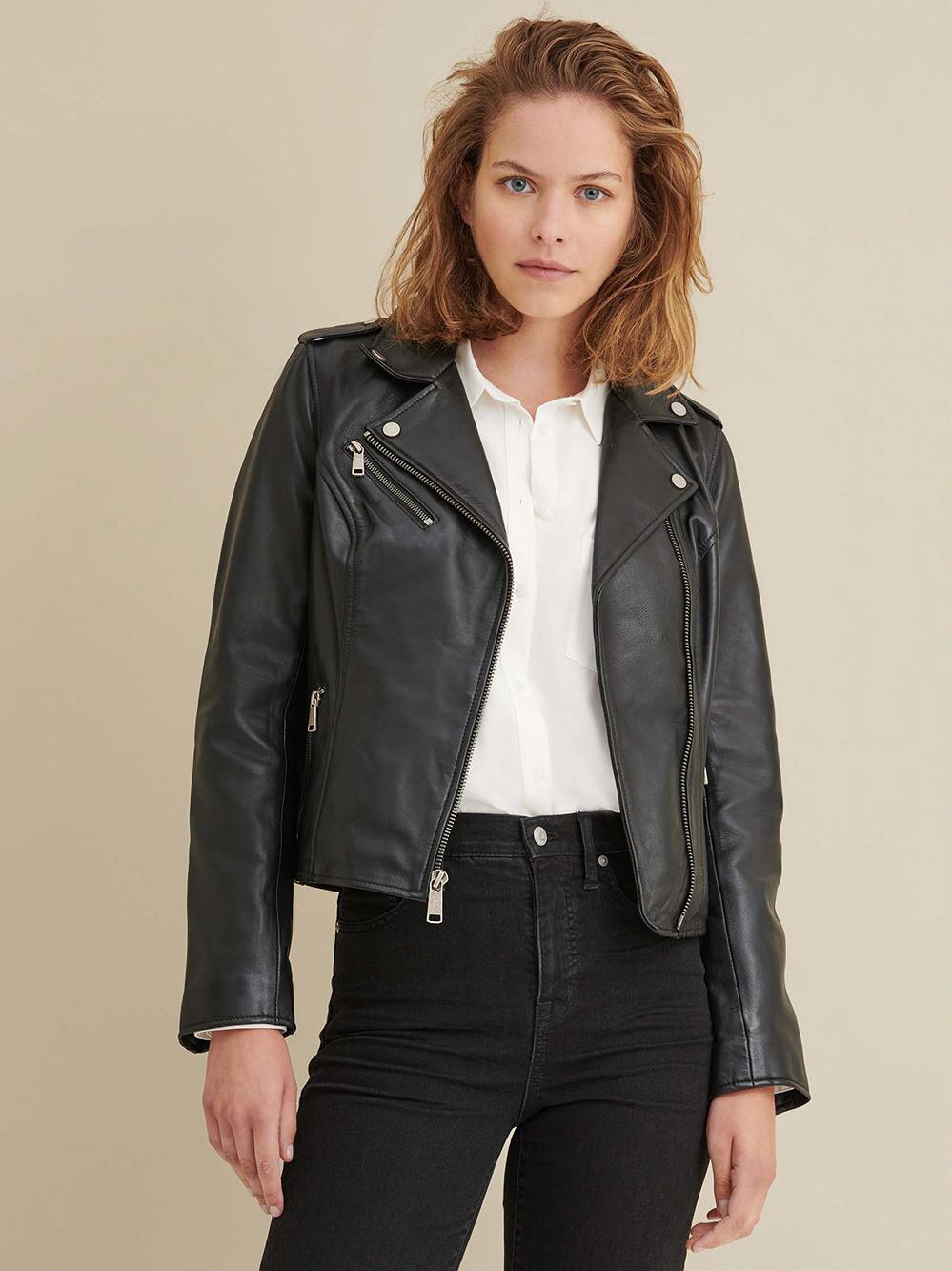 Smooth lambskin leather with a fine sheen and a collarless neckline that gives this short jacket its signature look. Women’s biker leather jackets are a popular style of outerwear that feature a fitted silhouette and typically include details such as an asymmetrical zipper, metal hardware, and often a moto-style collar. Biker jackets are a versatile piece of clothing that can be worn with both casual and dressy outfits, and are often paired with jeans, boots, and a t-shirt for a classic and edgy look.