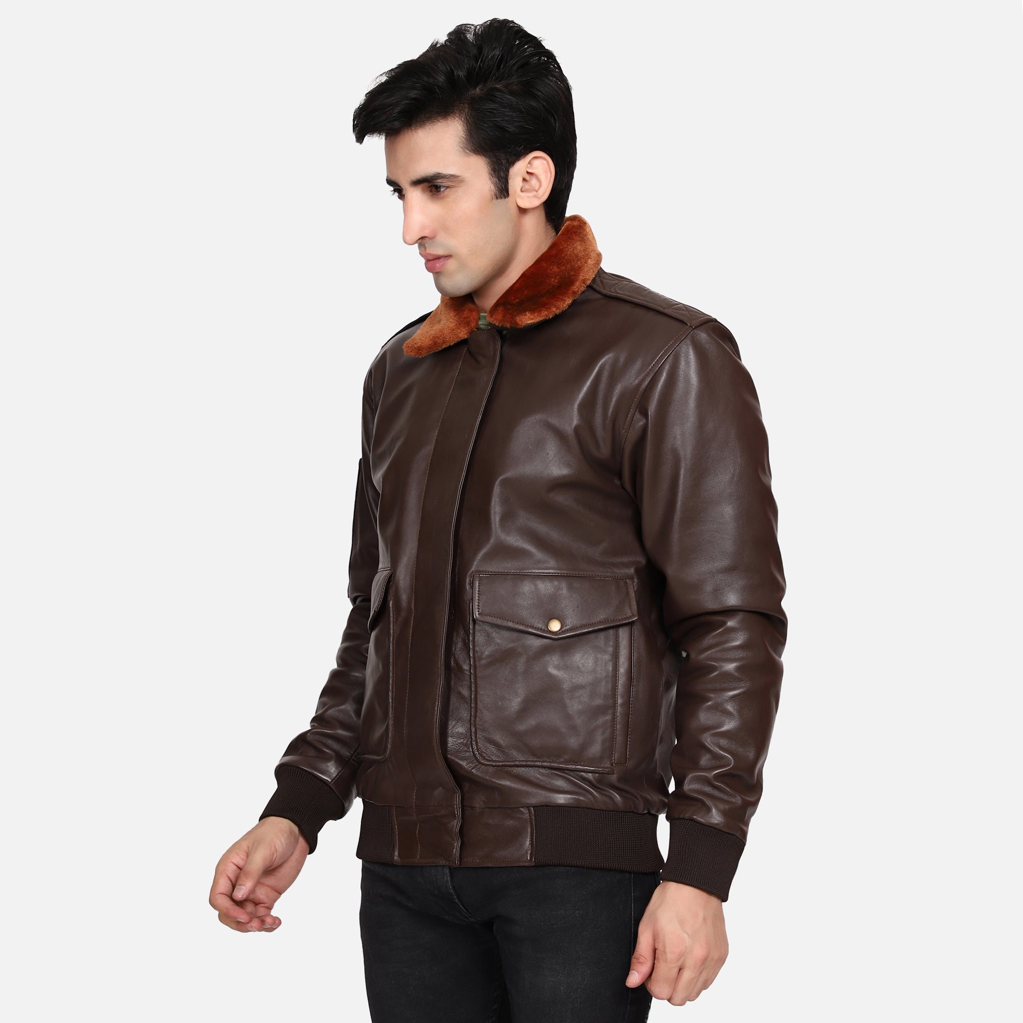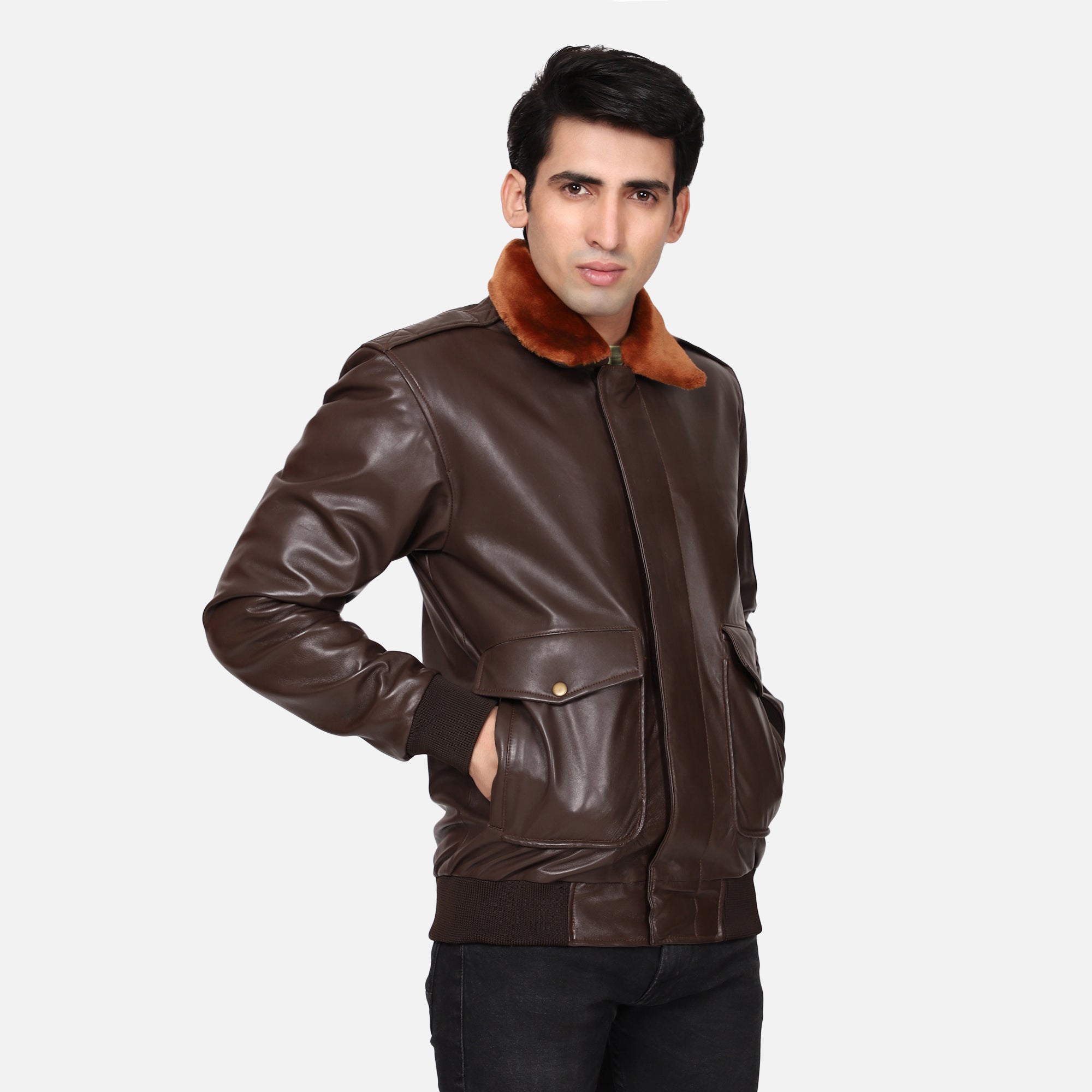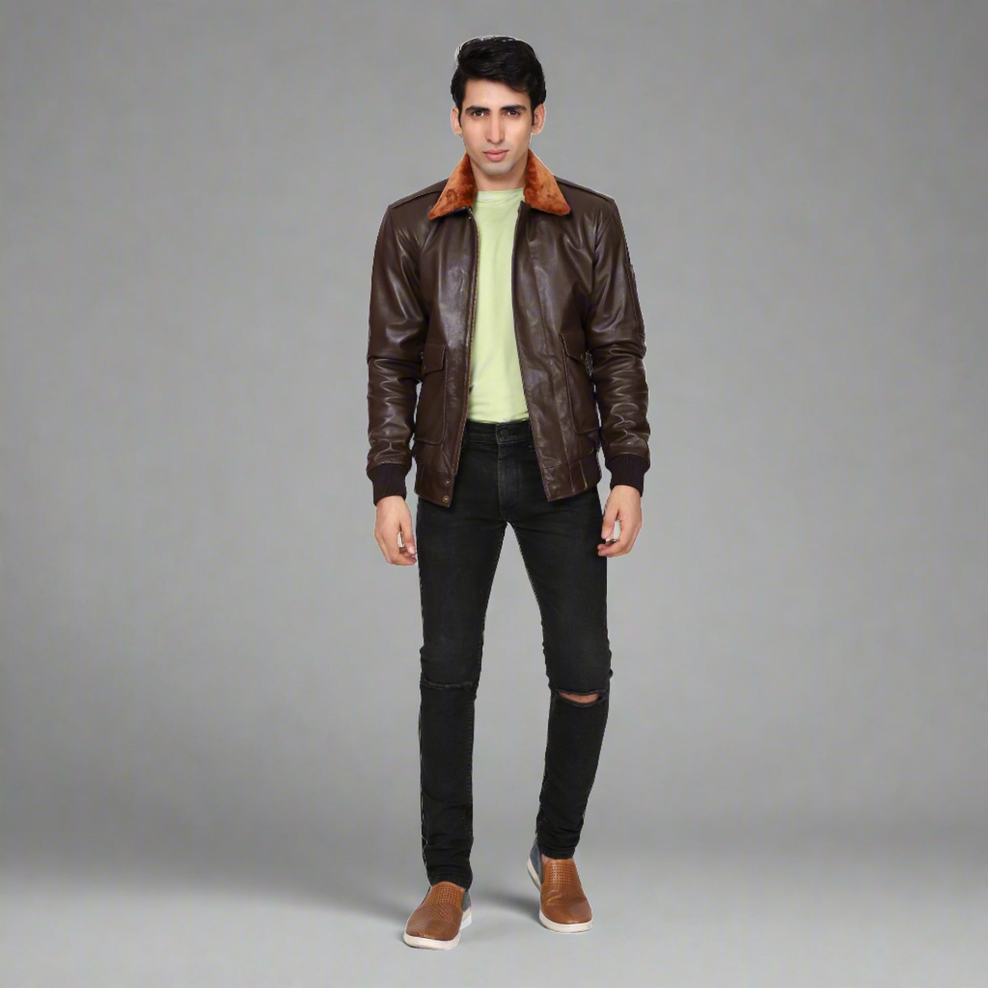Elevate your style with our Vikram Bomber Jacket. Made with genuine leather and a shearling collar, this jacket is both stylish and warm. Perfect for any occasion, it pairs well with any outfit and is sure to turn heads. Experience comfort and sophistication with our Vikram Bomber Jacket.